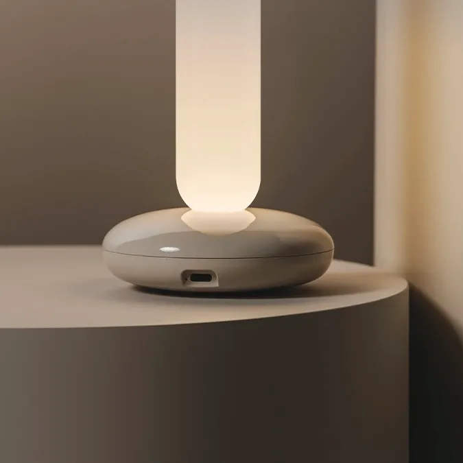 Alba permite ajustar fácilmente la intensidad mediante un interruptor integrado en su base. Su carga USB-C y diseño inalámbrico aportan libertad de uso.